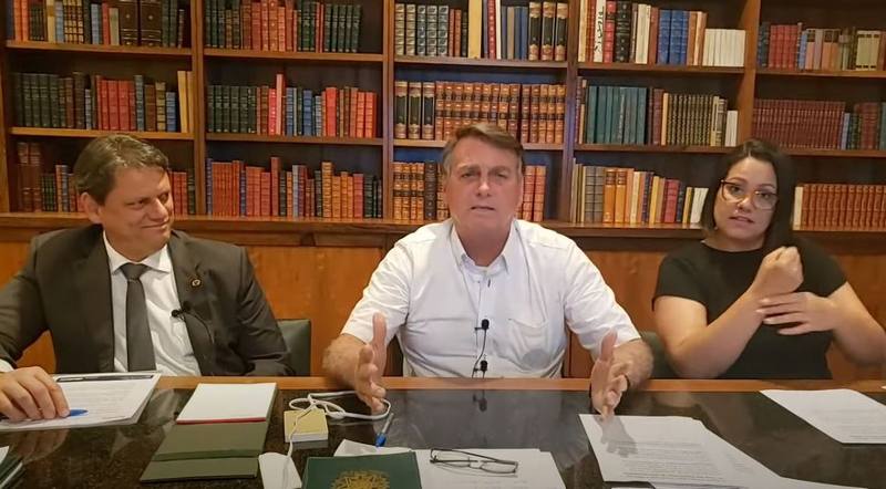 | Ministro Tarcisio de Freitas e o presidente Bolsonaro, durante a live desta quinta-feira (1º). |