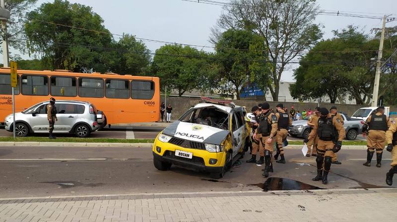 | Carro da PM capotou, nesta quarta-feira (9), em Curitiba �?? Foto: Cinegrafista Júnior Guimarães |